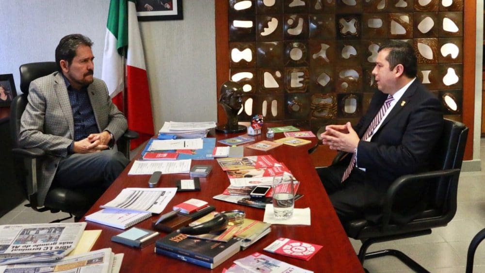 Morelia, Michoacán, a 5 de abril de 2017.- El director general del Telebachillerato Michoacán, Juan Carlos Barragán Vélez, se reunió con el delegado del Infonavit en la entidad, Julio Antonio Guajardo Villarreal, con la finalidad de revisar el adeudo de las prestaciones de los trabajadores del subsistema educativo.