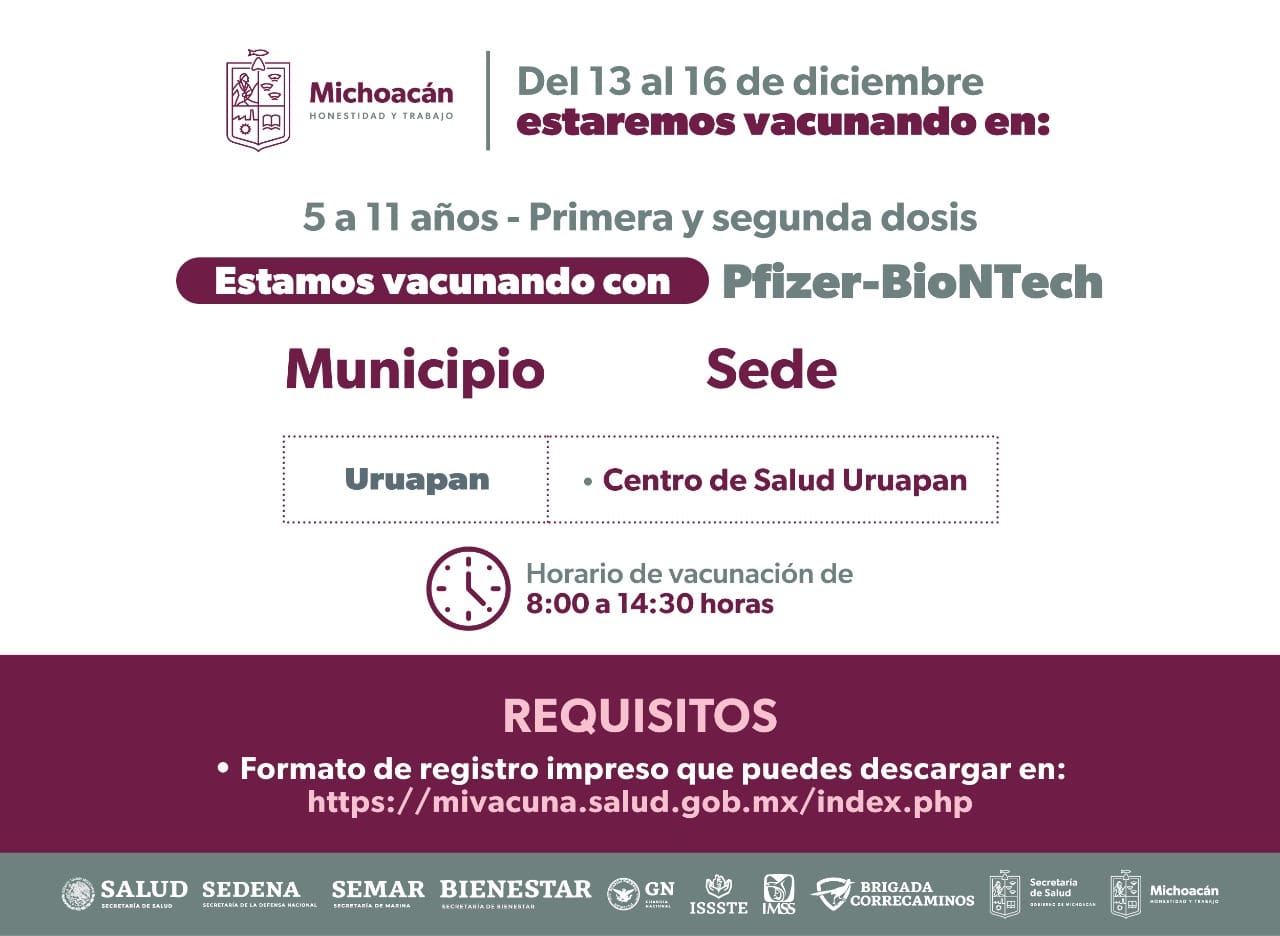 Morelia, Michoacán, 12 de diciembre del 2022.- Todos los rezagados, de 5 a 11 años que requieran la segunda dosis de Pfizer serán inmunizados en Uruapan, del 13 al 16 de diciembre.