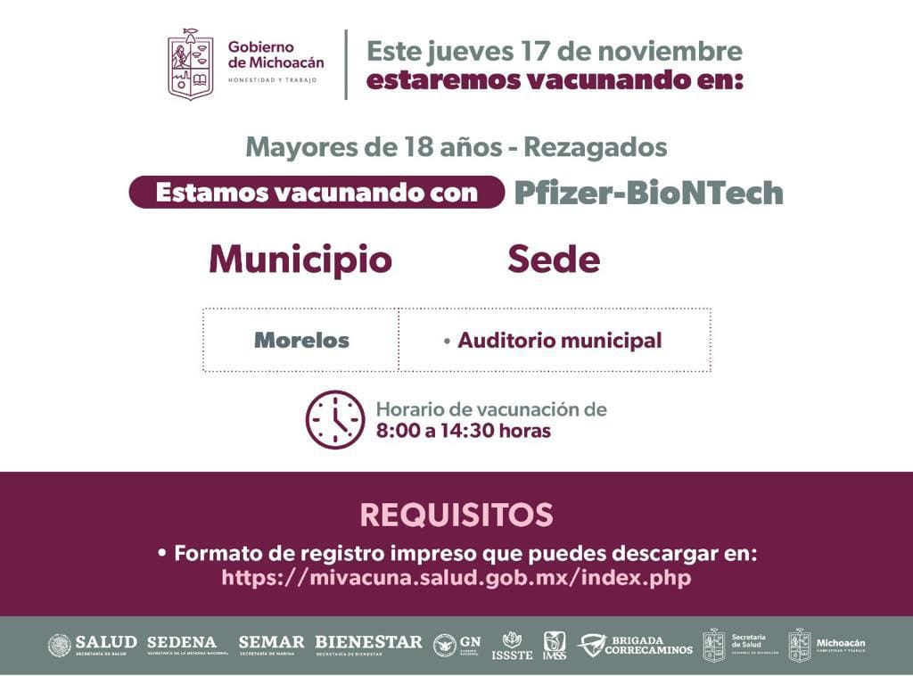 Para los michoacanos mayores de 18 que ya cuentan con la primera dosis de Pfizer y requieren la segunda aplicación para completar sus esquemas, también podrán solicitarla, y las sedes de vacunación serán anunciadas en las páginas oficiales de la SSM.