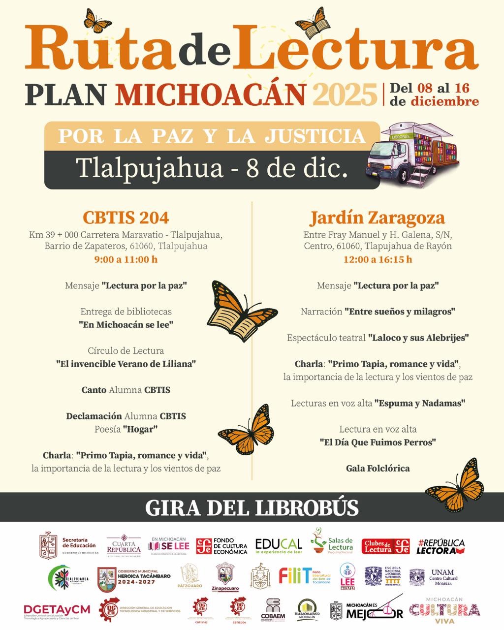 Las secretarías de Cultura y Educación de Michoacán, en coordinación con el Gobierno de México, llevarán a cabo una jornada de fomento a la lectura en Tlalpujahua, como parte de la Ruta de Lectura Plan Michoacán 2025, estrategia que se desarrollará del 8 al 16 de diciembre en distintos municipios del estado.