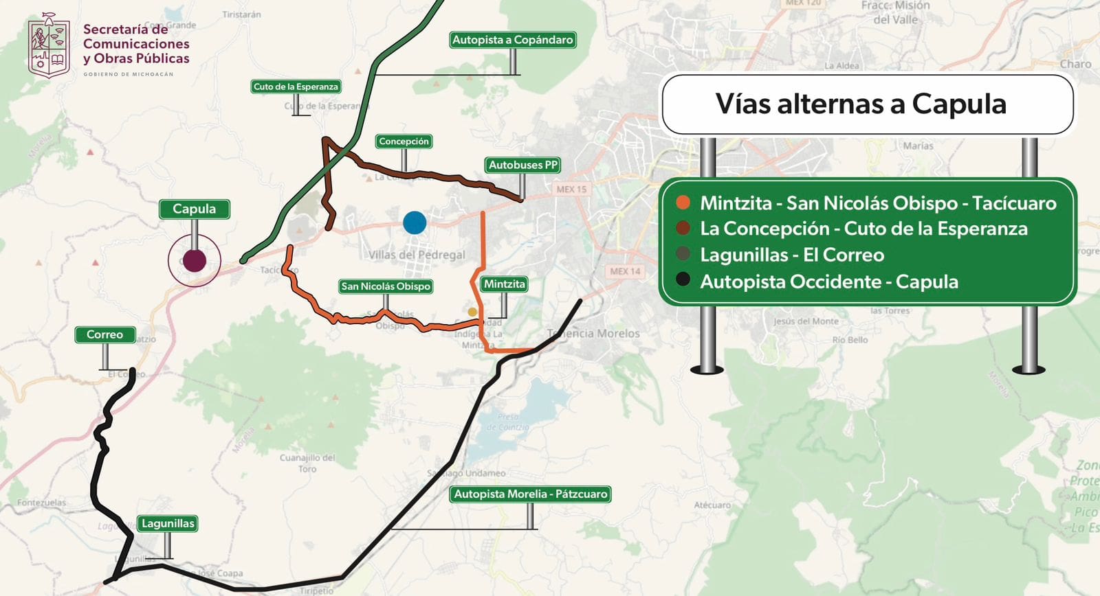 Rogelio Zarazúa Sánchez, titular de la SCOP, indicó que se han habilitado cuatro rutas alternas para evitar congestiones debido a la construcción en curso. Las carreteras La Mintzita-San Nicolás Obispo-Tacícuaro y La Concepción-Cuto de la Esperanza se presentan como opciones viables para quienes se dirigen a Capula.