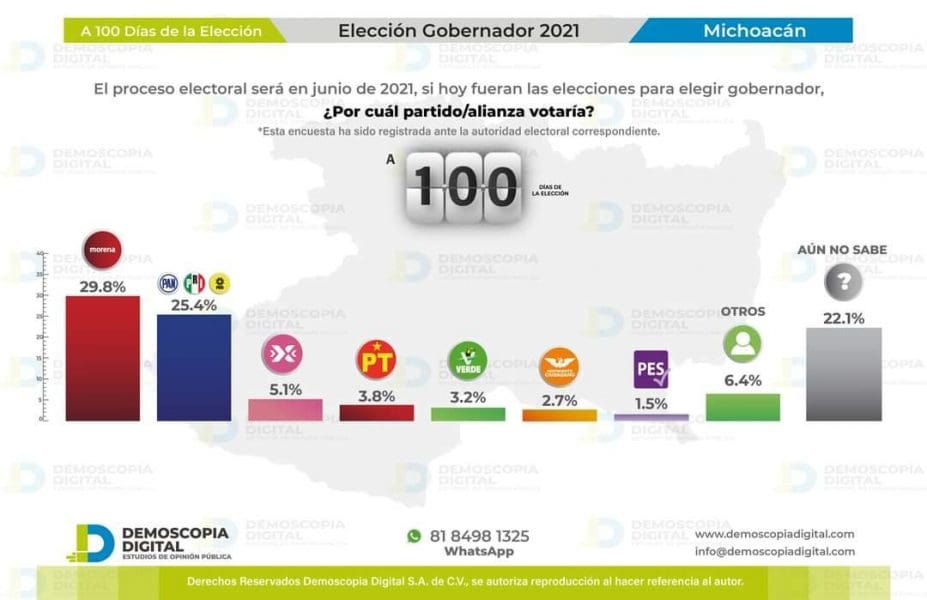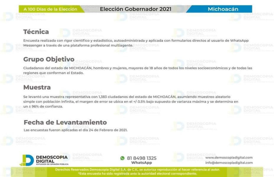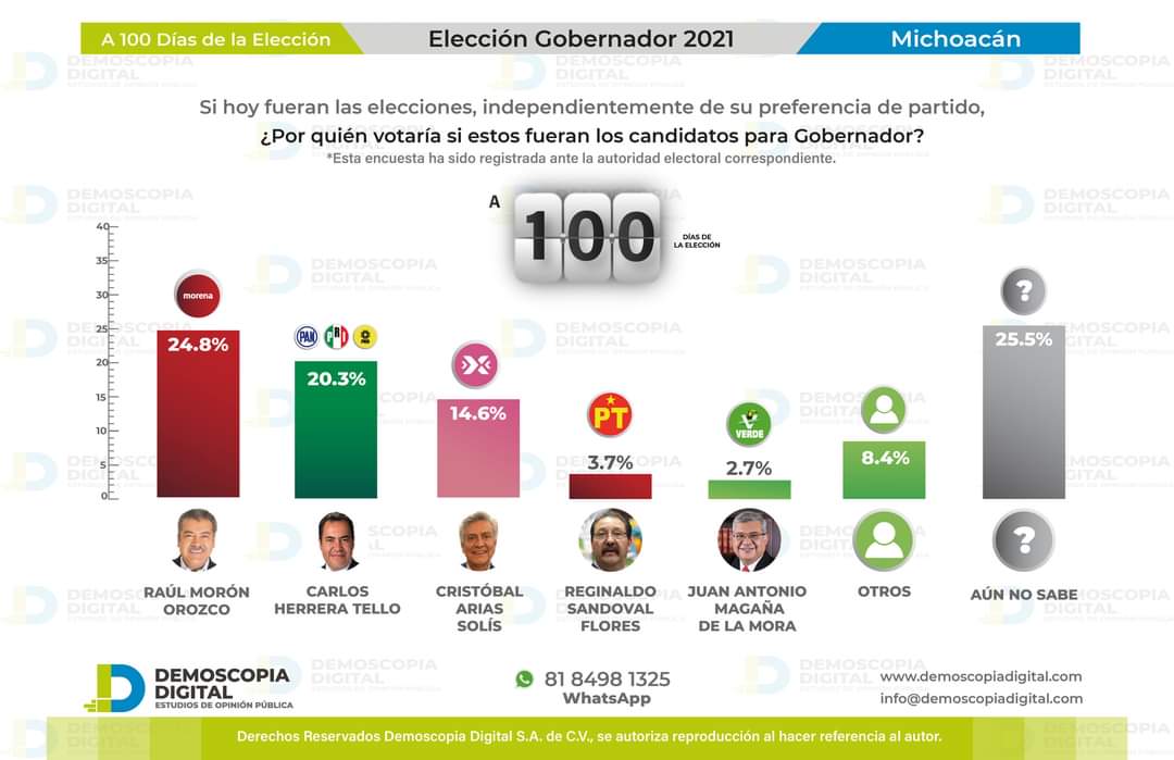Según la medición, Carlos Herrera Tello de Equipo por Michoacán (PRI, PAN y PRD), tiene un 20.3 % de la preferencia, mientras que Raúl Morón obtuvo un 24.8 %.