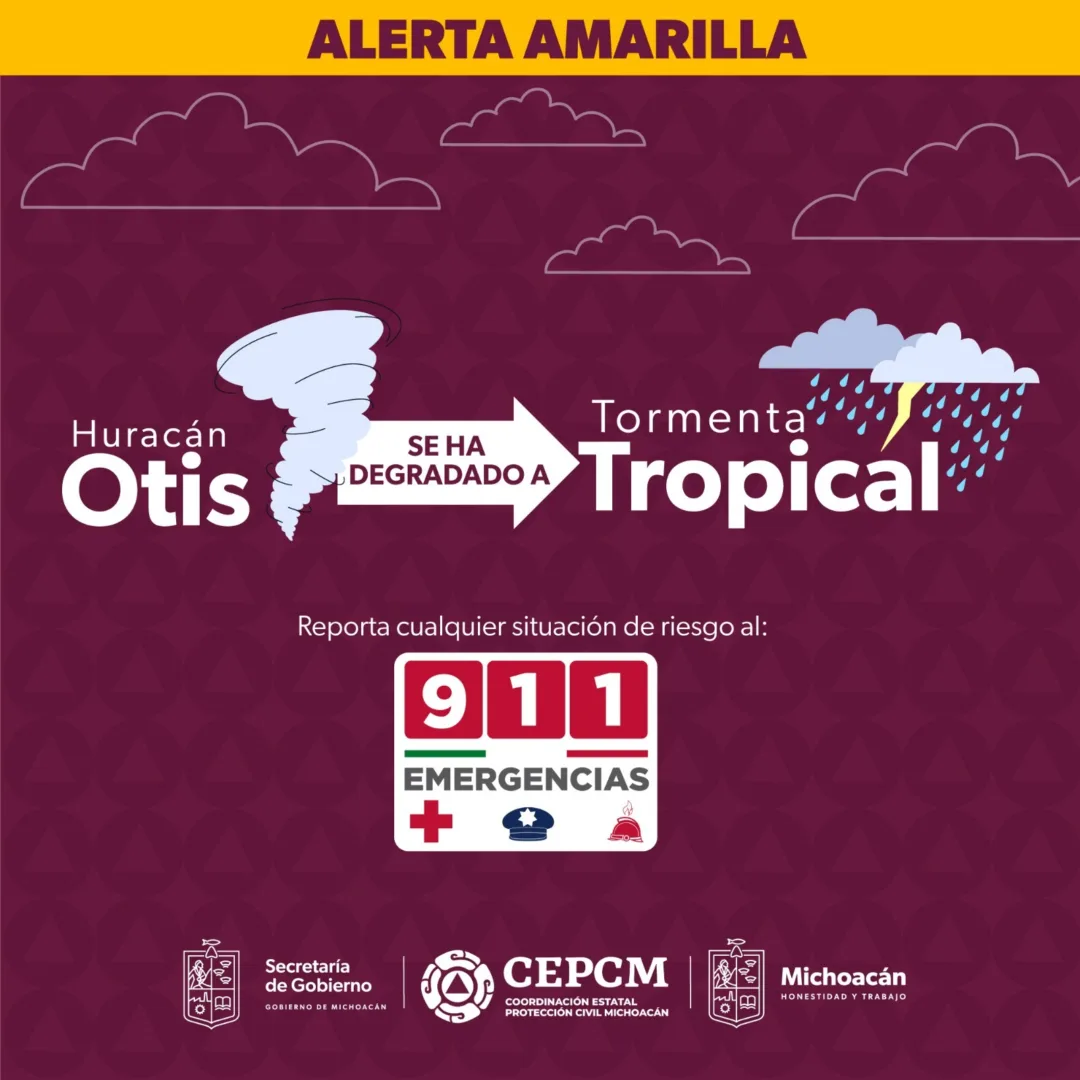 En este sentido, autoridades de Protección Civil declararon alerta amarilla en los municipios de Aguililla, Apatzingán, Aquila, Arteaga, Buenavista, Carácuaro, Coahuayana, Coalcomán, Chinicuila, Churumuco, La Huacana, Huetamo, Lázaro Cárdenas, Múgica, Nocupétaro, Parácuaro, San Lucas, Tepalcatepec, Tiquicheo y Tumbiscatío.