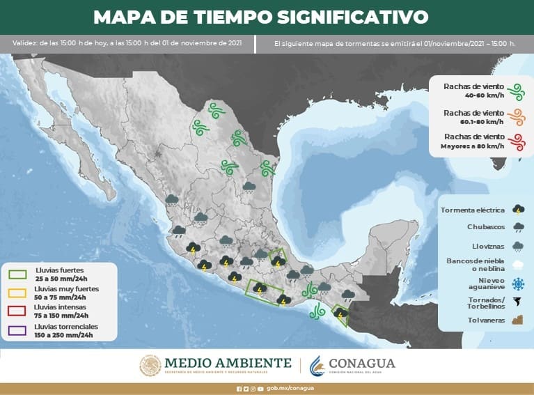 Con información del Servicio Meteorológico Nacional, un canal de baja presión que se extenderá sobre el occidente y centro de México, así como por el flujo de humedad proveniente del Océano Pacífico y el Golfo de México, provocarán lluvias fuertes, de 25 a 50 milímetros, con posible caída de granizo y descargas eléctricas