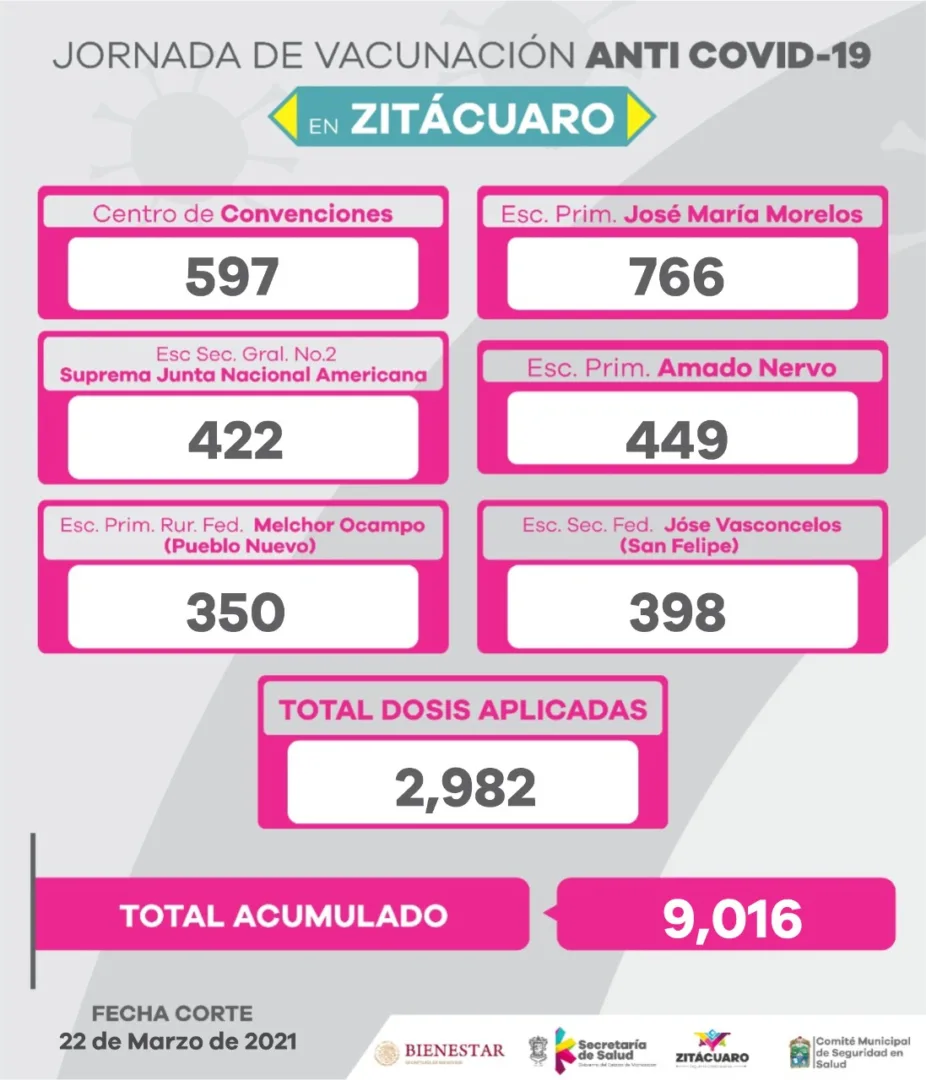 El Comité Municipal de Seguridad en Salud, informa que en el tercer día de la jornada de vacunación contra COVID-19 a personas de 60 años y más, concluyó con éxito en el municipio, con 2,982dosis aplicadas y 9,016 acumuladas.