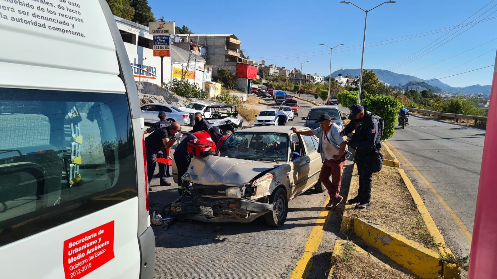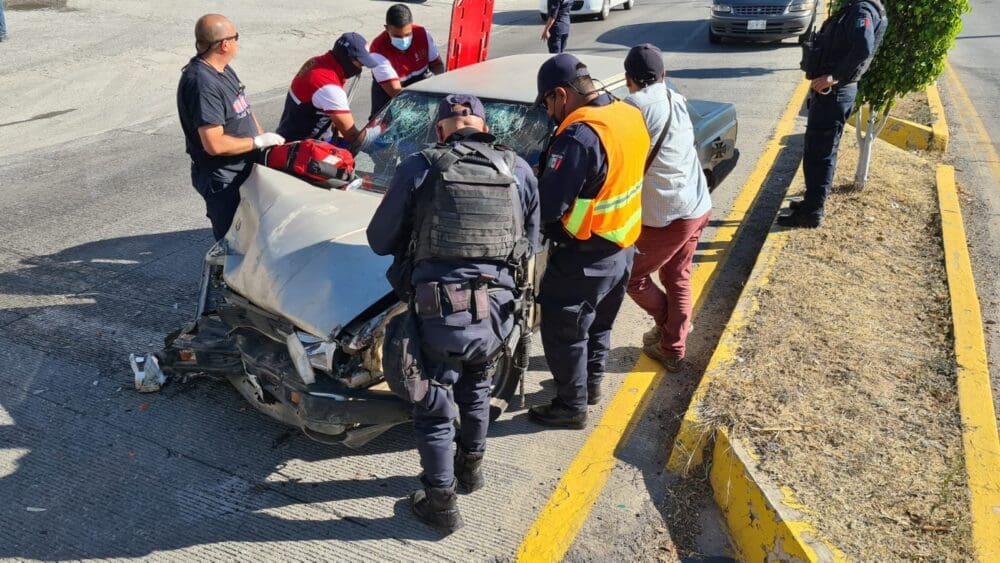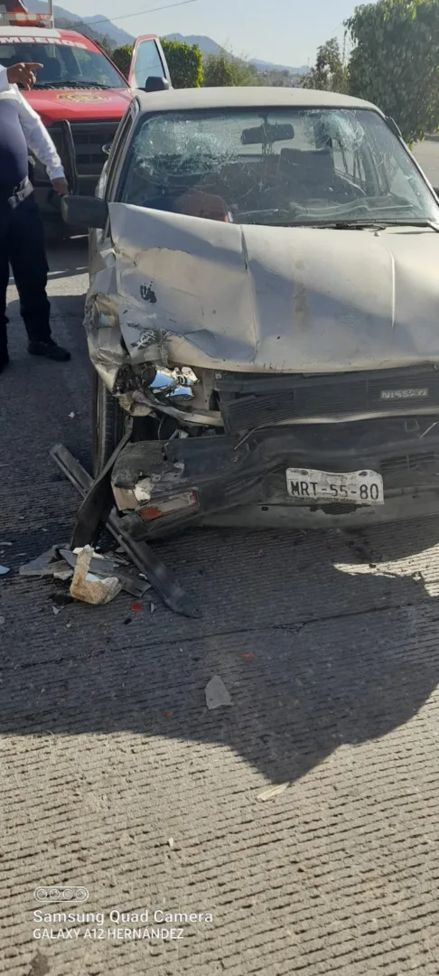 Al llegar al lugar se visualizan dos vehiculos, un Nissan Tsuru color arena con el cual era conducido por un masculino de 52 años de edad, quien a la valoración de los elementos, presentaba herida cortante en parte frontal del cráneo. Estaba acompañado por una femenina de 49 años de edad quien se encontraba politraumatizada, por lo que ambos son trasladados al hospital regional
