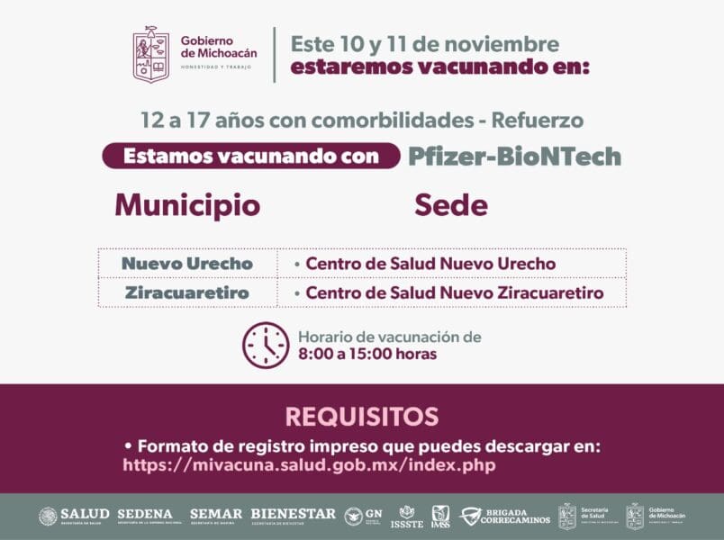 Morelia, Michoacán, 6 de noviembre del 2022.- La cacuna anti COVID-19 para jóvenes de 12 a 17 años con comorbilidades; así como los refuerzos, serán aplicadas del 7 al 11 en diversos municipios.