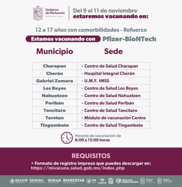 Así como en el Hospital Integral de Cherán, la U.M.F. IMSS de Gabriel Zamora, el módulo de vacunación centro de Taretan y la Unidad Deportiva “Ejército de la Revolución” de Morelia serán las sedes para la inmunización de este grupo poblacional.