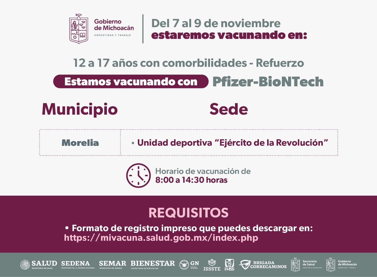 Morelia, Michoacán, 6 de noviembre del 2022.- La cacuna anti COVID-19 para jóvenes de 12 a 17 años con comorbilidades; así como los refuerzos, serán aplicadas del 7 al 11 en diversos municipios.