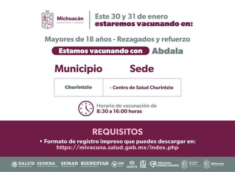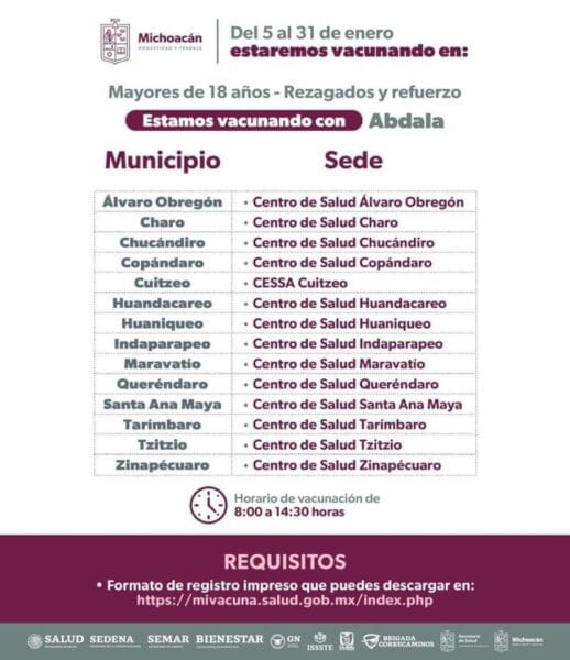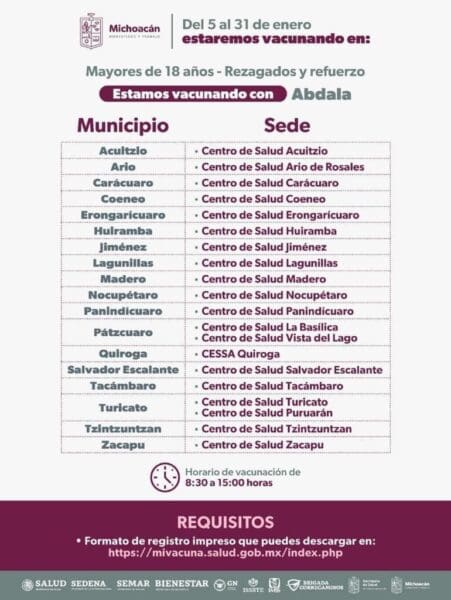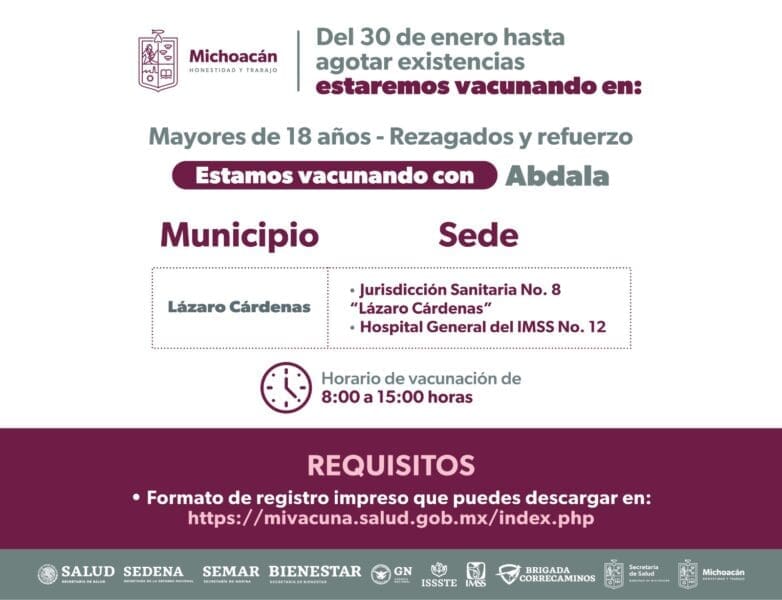Mientras, que en la Jurisdicción Sanitaria 8 de Lázaro Cárdenas y en el Hospital General del IMSS No. 12; así como en 9 Centros de Salud de esa región se seguirá inmunizando a los mayores de 18 años hasta agotar existencia. Lo mismo que en Aquila y Coahuayana.