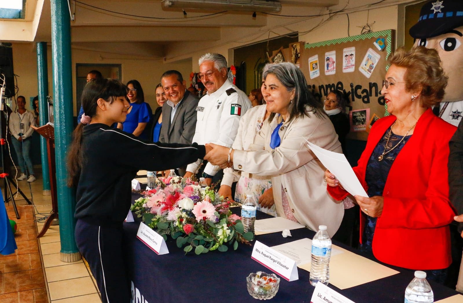 Marín Correa y la directora del plantel, María Raquel Rangel Villaseñor, destacaron la importancia de inculcar en los menores los valores que deben respetar día a día, en su escuela, con la familia, amigos y comunidad.