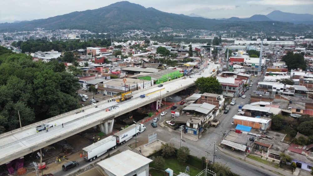 Rogelio Zarazúa Sánchez, titular de la SCOP, detalló que el proyecto se encuentra en su etapa final de ejecución. Actualmente, los trabajos se concentran en el colado de losas de superestructura, así como en la instalación de barreras, parapetos y sistemas de luminarias en las rampas norte y sur del complejo.