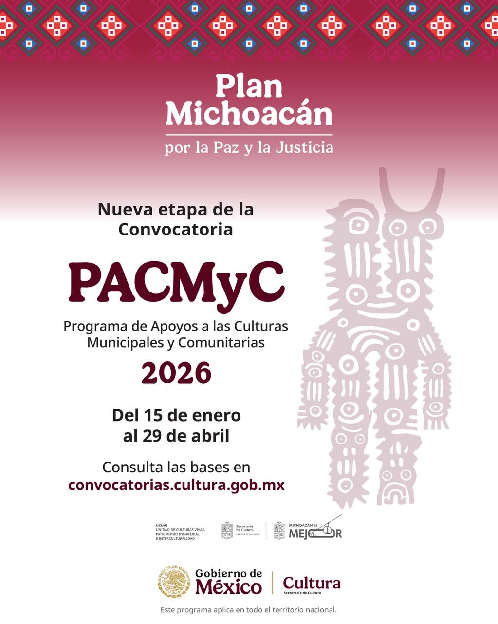 La Secretaría de Cultura de Michoacán (Secum) y la Secretaría de Cultura federal informaron la apertura de la convocatoria del Programa de Apoyos a las Culturas Municipales y Comunitarias (Pacmyc) 2026, la cual cuenta con un fondo total de seis millones de pesos.