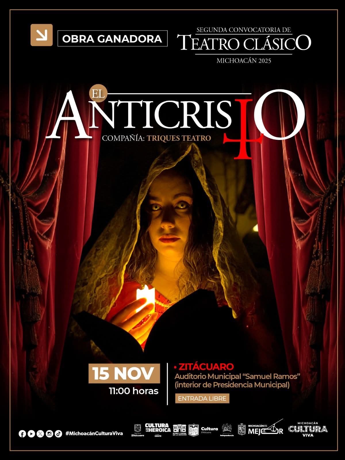 La Secretaría de Cultura de Michoacán (Secum) anunció la presentación de la obra teatral “El Anticristo” en el municipio de Zitácuaro.