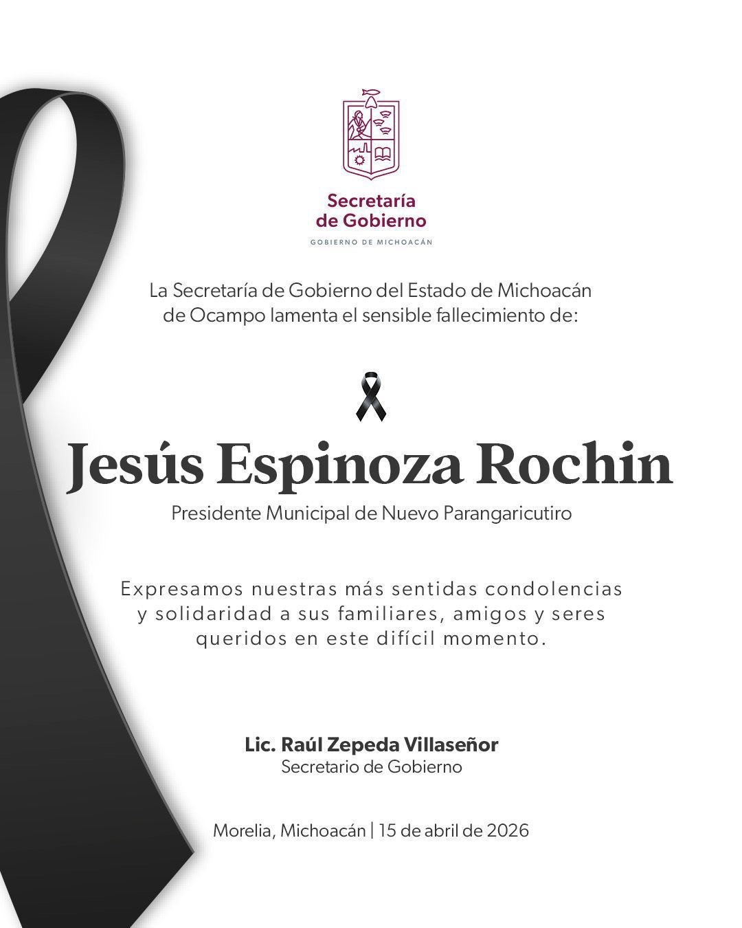 El secretario de Gobierno, Raúl Zepeda Villaseñor, expresó el pesar del Gobierno de Michoacán por el fallecimiento del presidente municipal de Nuevo Parangaricutiro. El deceso ocurrió en un centro hospitalario mientras el munícipe recibía atención médica tras someterse a una intervención quirúrgica derivada de un padecimiento de salud. El encargado de la política interna del estado manifestó su solidaridad con la familia, amistades y los habitantes de la demarcación ante la pérdida del edil, a quien reconoció por su labor y compromiso con el desarrollo de su comunidad.
