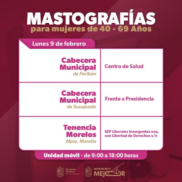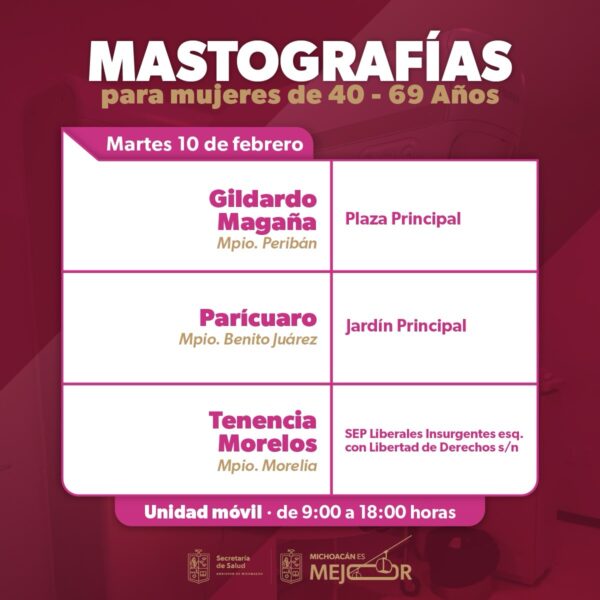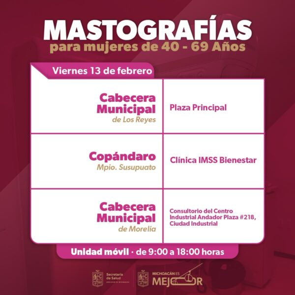 La Secretaría de Salud de Michoacán (SSM) anunció que sus unidades móviles de mastografía operarán en seis municipios del estado entre el 9 y el 13 de febrero. De acuerdo con la información difundida por la dependencia, esta jornada de servicios gratuitos está dirigida a mujeres con edades comprendidas entre los 40 y 69 años.
