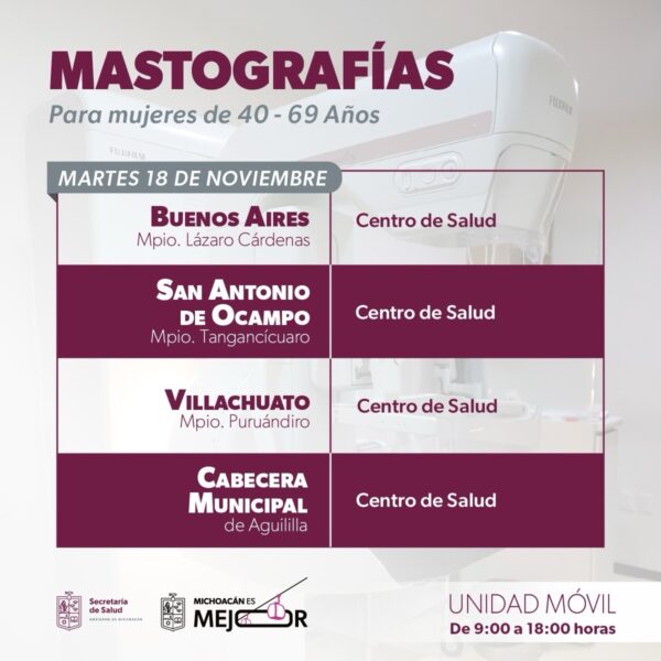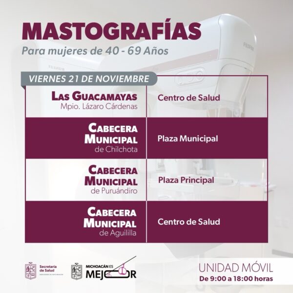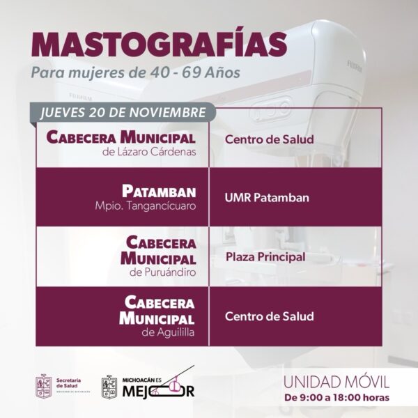 La Secretaría de Salud de Michoacán (SSM) ha anunciado el despliegue de unidades móviles de mastografía para la detección oportuna de cáncer de mama en mujeres de cinco municipios del estado. La SSM informó que los estudios serán gratuitos y están dirigidos a mujeres michoacanas de 40 a 69 años.