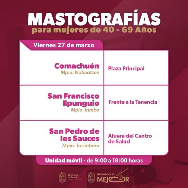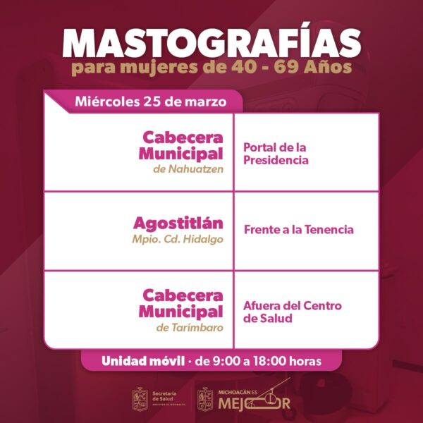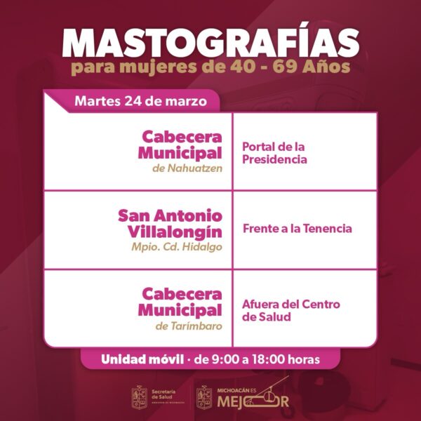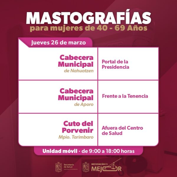 La Secretaría de Salud de Michoacán (SSM) informó sobre el despliegue de unidades móviles para la realización de mastografías gratuitas en siete municipios de la entidad, programado del 23 al 27 de marzo de 2026. Según el reporte de la institución, la medida busca facilitar el acceso a estudios de detección de cáncer de mama en diversas regiones del estado.