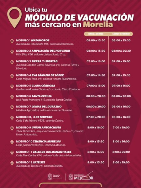 La Secretaría de Salud de Michoacán informó que ha dispuesto 12 módulos activos en Morelia para la aplicación de la vacuna contra el sarampión, adicionales a la atención permanente en el Centro de Salud “Dr. Juan Manuel González Urueña”.