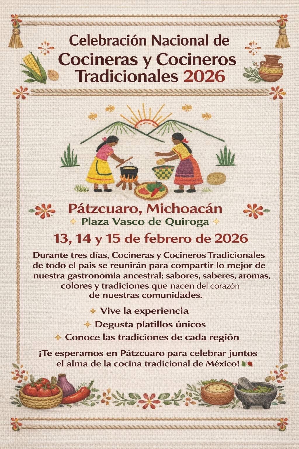 La Secretaría de Turismo del Estado (Sectur) informó que Michoacán será la sede de la Celebración Nacional de Cocineras y Cocineros Tradicionales de México 2026. El evento se llevará a cabo del 13 al 15 de febrero en la Plaza Vasco de Quiroga, en el municipio de Pátzcuaro.