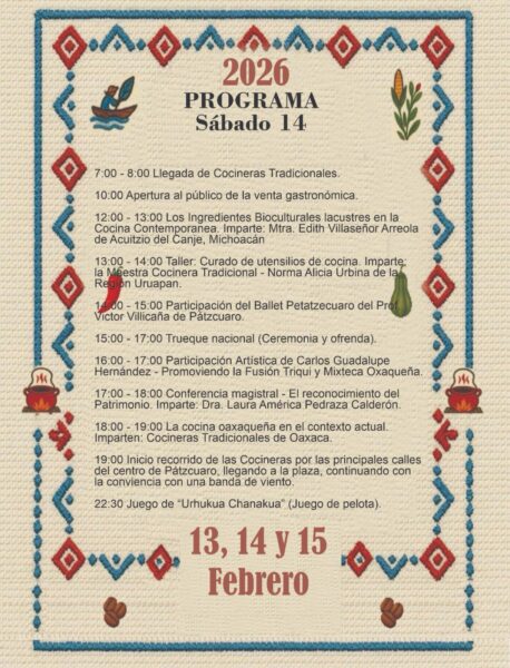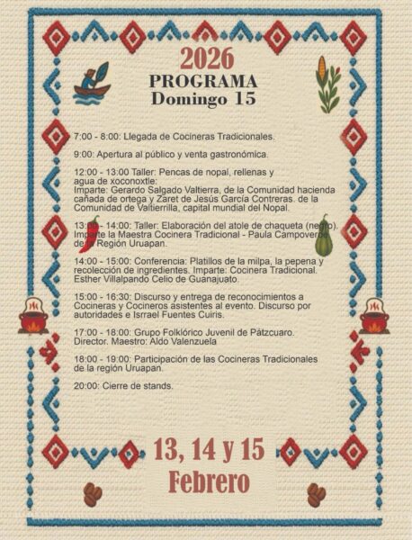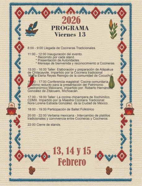 La inauguración formal está programada para el viernes 13 de febrero a las 11:00 horas. Posteriormente, a las 13:00 horas, se realizará un taller de elaboración de atápakua de chilacayote a cargo de la cocinera tradicional María Elena Reyes Remigio, originaria de la comunidad de Cocucho. La programación detallada se encuentra disponible en las plataformas digitales oficiales de la dependencia estatal y del gobierno municipal.