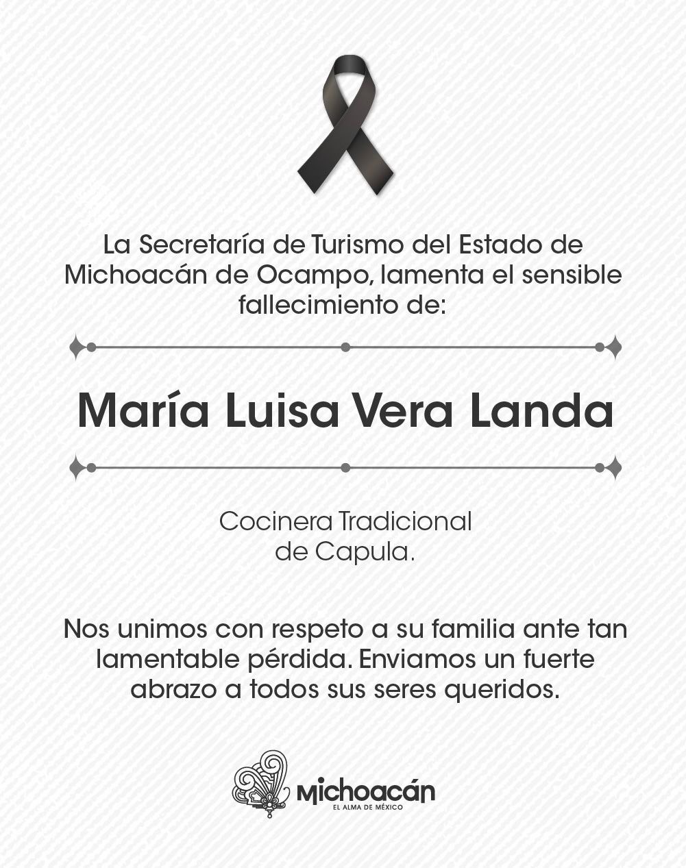 La Secretaría de Turismo de Michoacán (Sectur) informó sobre el fallecimiento de María Luisa Vera Landa, destacada cocinera tradicional originaria de la tenencia de Capula. La institución reconoció la labor de la cocinera en la preservación y difusión de la cultura gastronómica regional, destacando su compromiso con las técnicas culinarias ancestrales que definen la identidad del estado.