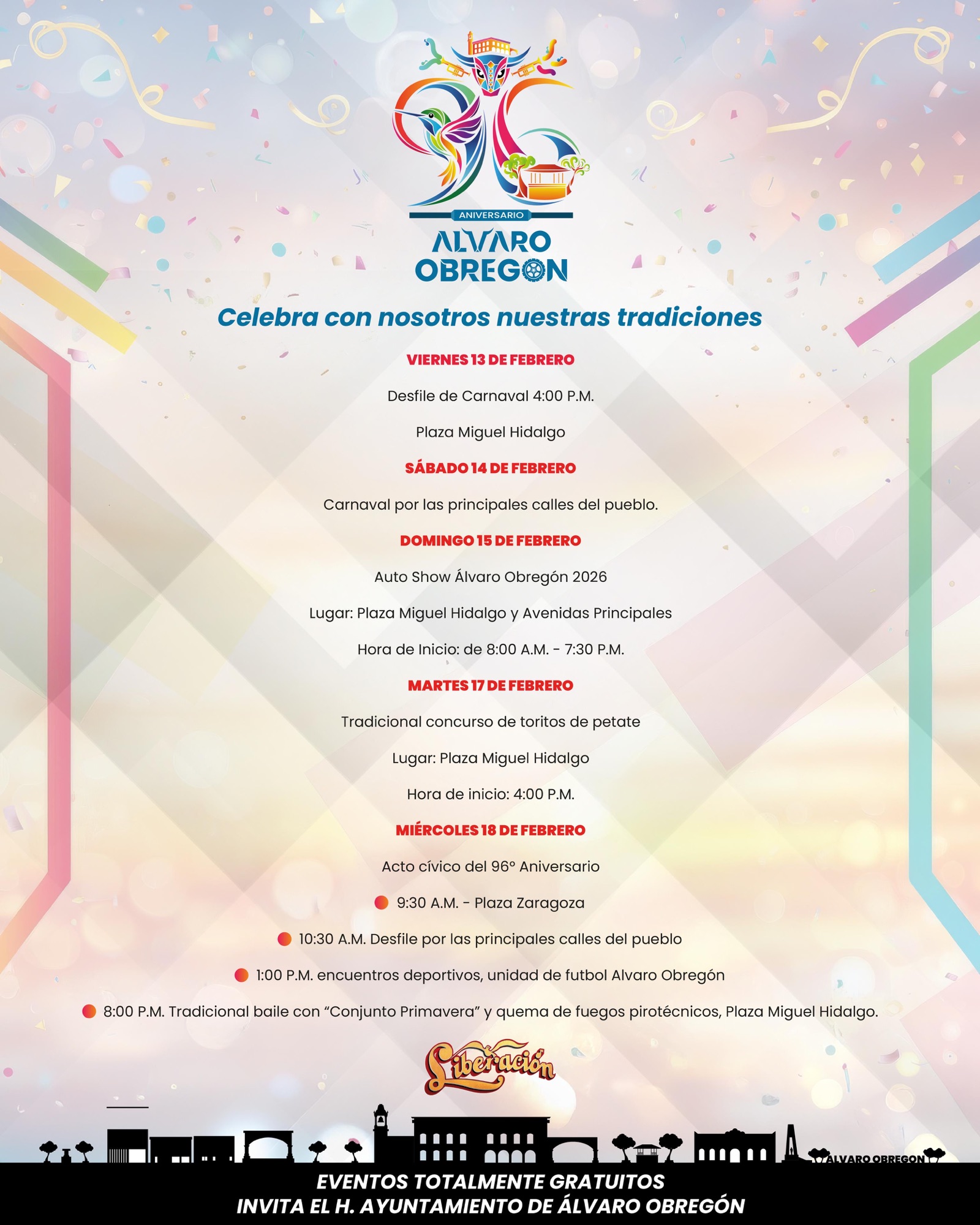 18 de febrero: Acto cívico conmemorativo por el 96 aniversario del municipio, programado a las 09:00 horas.