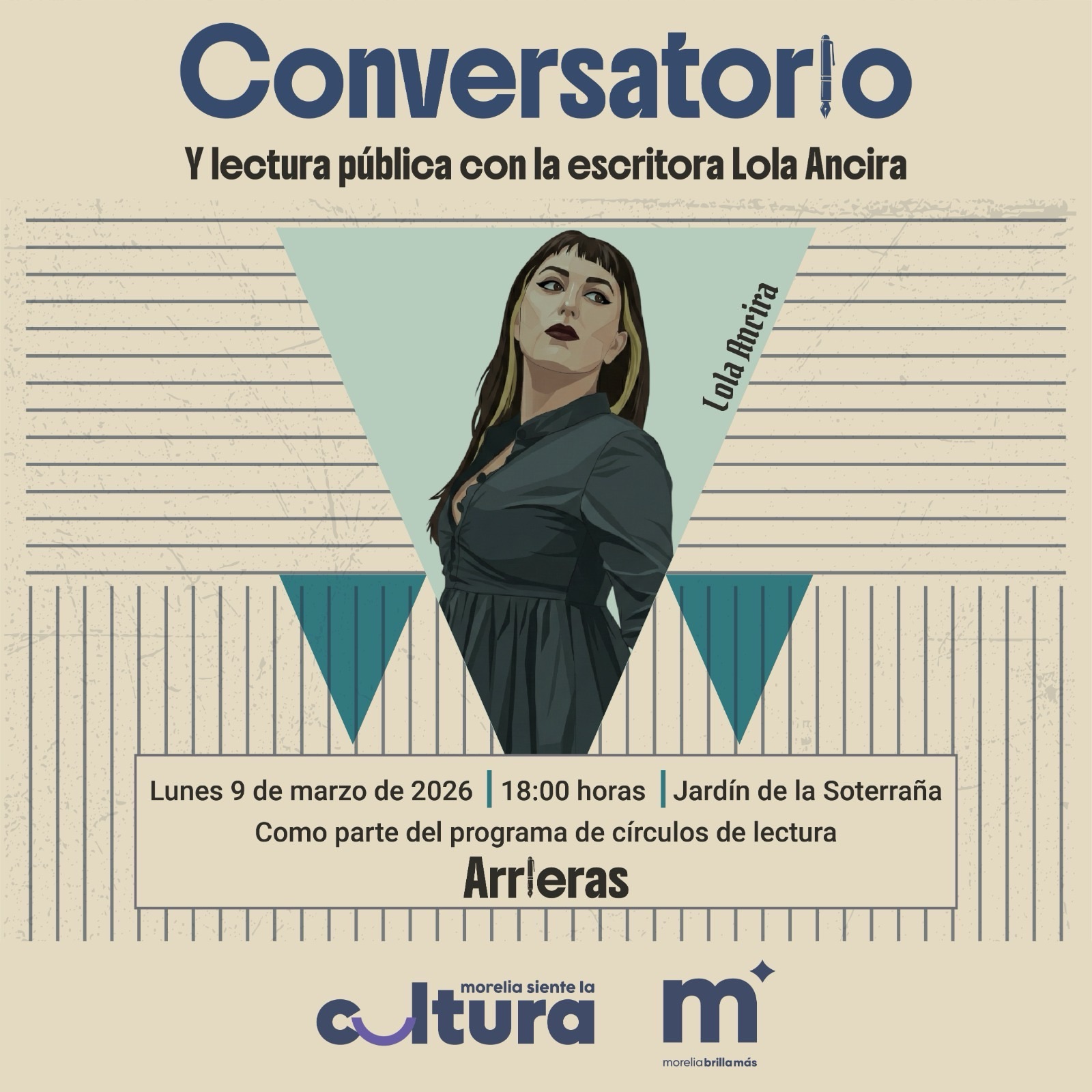 La Secretaría de Cultura de Morelia (SeCultura) invita a la ciudadanía a participar en un conversatorio y lectura pública con la destacada escritora Lola Ancira, evento que se llevará a cabo el próximo lunes 9 de marzo en el Jardín de la Soterraña, ubicado en el Centro Histórico de la capital michoacana, a partir de las 18:00 horas. Esta actividad se desarrolla como parte de las acciones del Círculo de Lectura “Arrieras”, impulsado por la administración del presidente municipal Alfonso Martínez Alcázar, con el fin de consolidar espacios de reflexión, diálogo y construcción de comunidad.