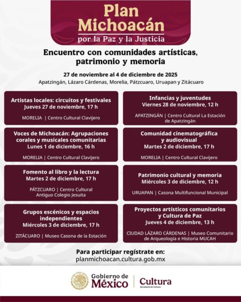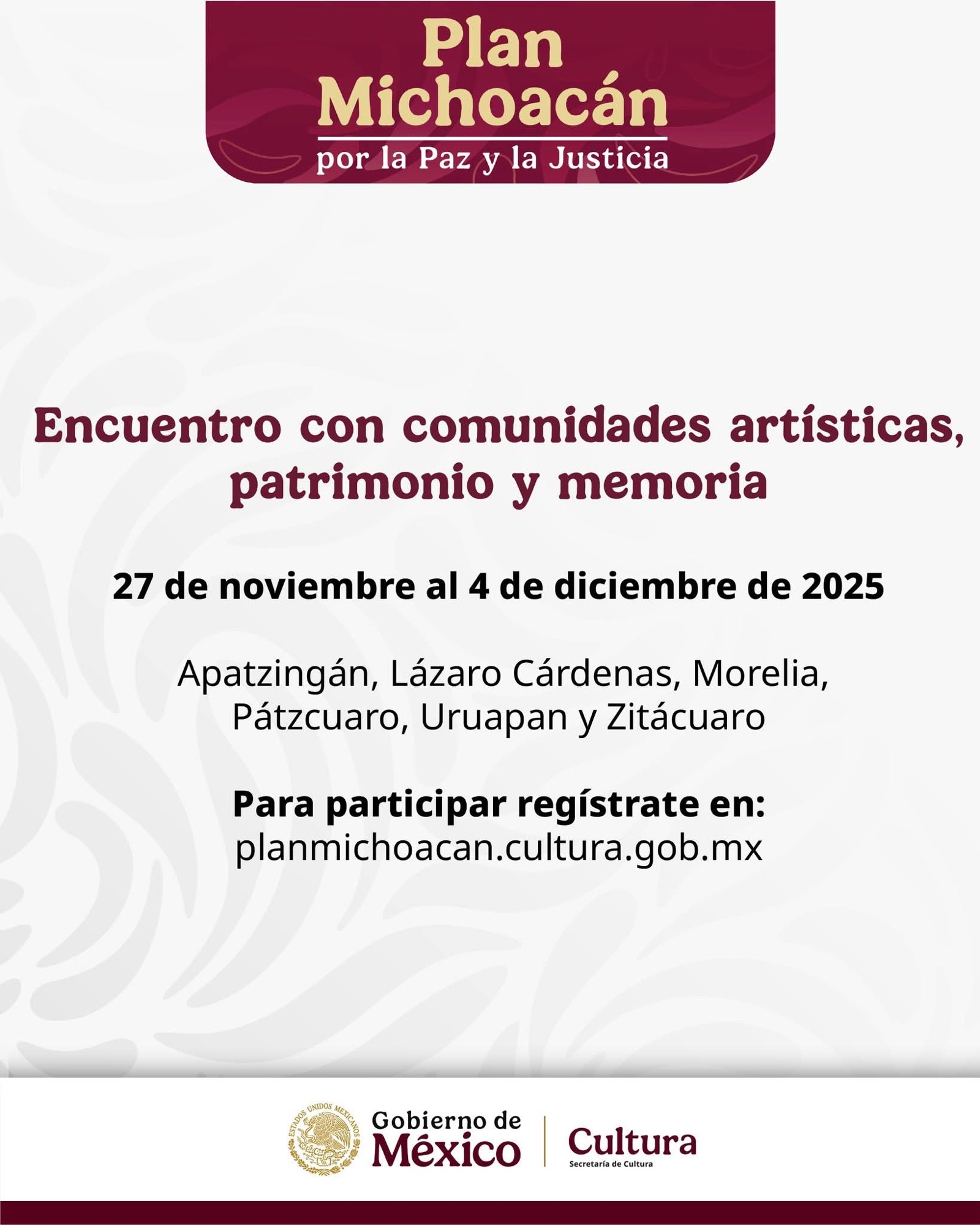 La Secretaría de Cultura de Michoacán (Secum) anunció la apertura del registro para el encuentro “Comunidades artísticas, patrimonio y memoria”, que se llevará a cabo del 27 de noviembre al 4 de diciembre de 2025, según informó la dependencia el 25 de noviembre. El evento se enmarca en el Plan Michoacán por la Paz y la Justicia.