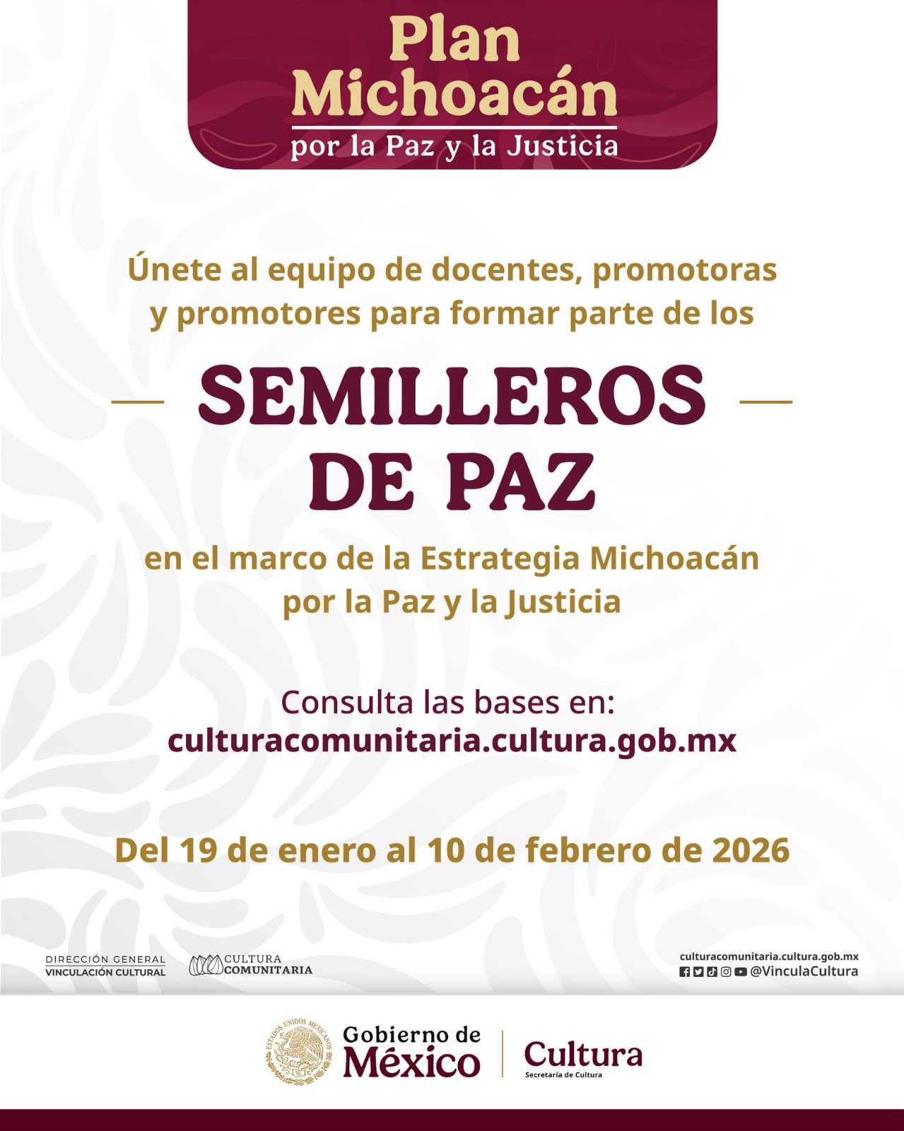 Esta iniciativa responde a la visión humanista del gobierno estatal, que reconoce en la cultura una vía eficaz para la prevención del delito y la promoción de la justicia social. Al profesionalizar a los promotores y docentes en el territorio, se asegura que el impacto del Plan Michoacán sea profundo y duradero. Para dudas o aclaraciones, las autoridades han puesto a disposición el correo electrónico semillerosdepaz@cultura.gob.mx, reafirmando que la cultura es un derecho que debe llegar a todos los rincones del estado.
