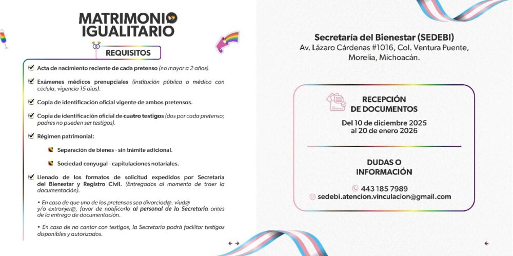 La Secretaría del Bienestar (Sedebi) de Michoacán, bajo la dirección de Andrea Serna Hernández, informó que el próximo 20 de enero finalizará el plazo para la recepción de documentos de las personas interesadas en participar en la jornada de “Bodas de la Diversidad Sexual y Reconocimientos al Cambio de Identidad de Género”.