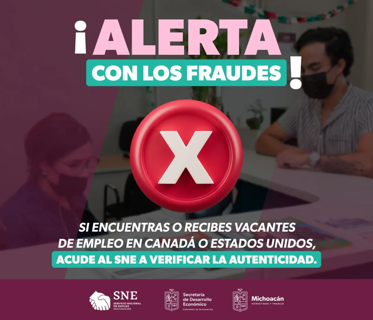 Las cuentas que utilizan indebidamente la imagen del Gobierno de Michoacán y del Servicio Nacional del Empleo (SNE) se encuentran en Facebook, con mayor énfasis en el municipio de La Piedad bajo el nombre de Gustavo Arias, y Arquitecto Néstor León, y al número no oficial 4437202602, situación que constituye un delito.
