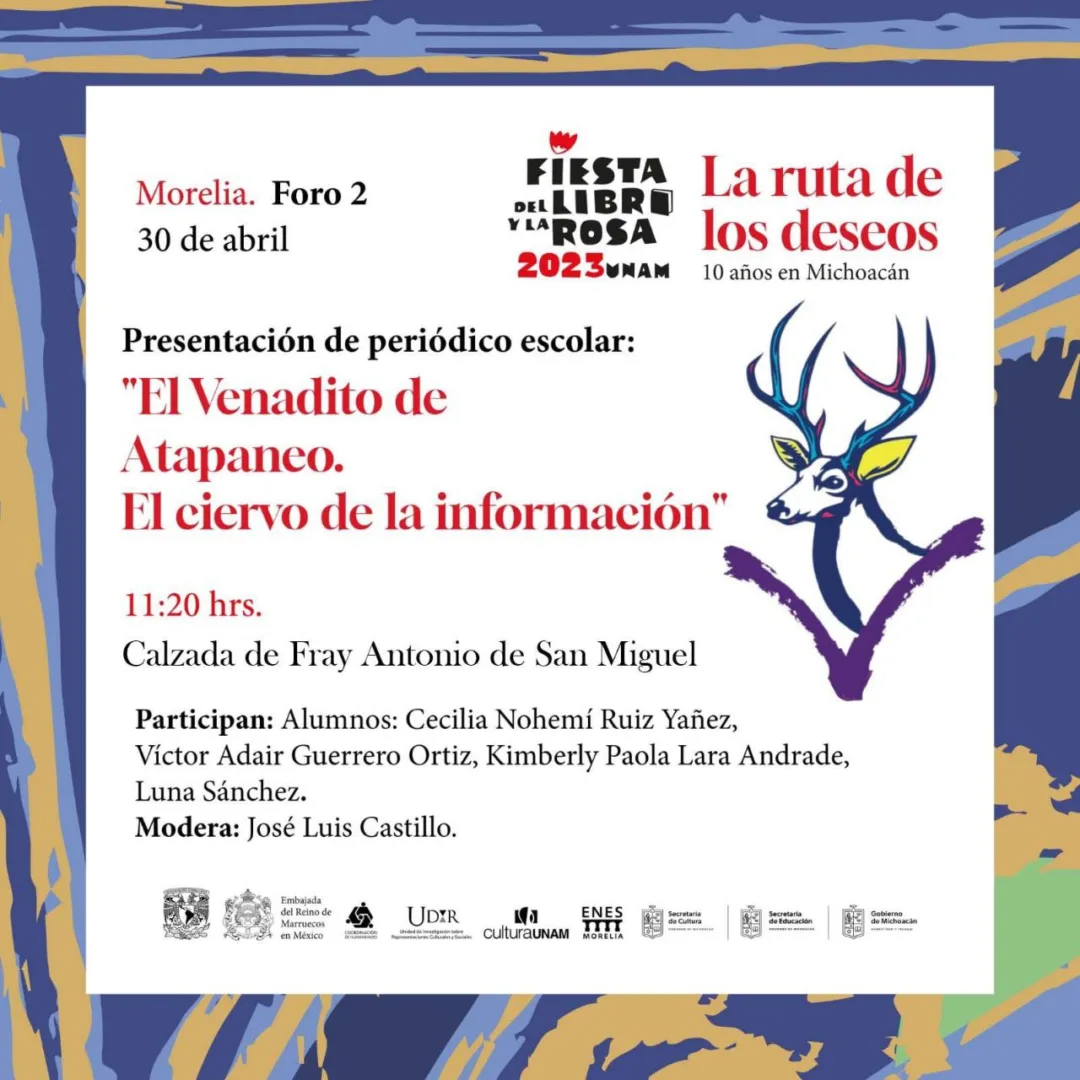 Morelia, Michoacán, 26 de abril de 2023.- Para la Secretaría de Educación del Estado (SEE) es fundamental apoyar, participar y contribuir en la Fiesta del Libro y de la Rosa 2023 que realiza la Universidad Nacional de México (UNAM), y que tendrá actividades del 28 al 30 de abril.