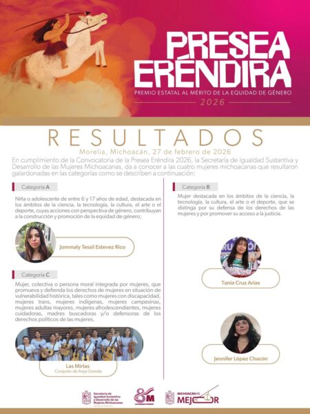 La Secretaría de Igualdad Sustantiva y Desarrollo de las Mujeres Michoacanas (Seimujer) hizo pública la lista de las galardonadas con la Presea Eréndira 2026, un reconocimiento estatal dirigido a mujeres, niñas y colectivas que inciden en la equidad de género y los derechos humanos en la entidad.