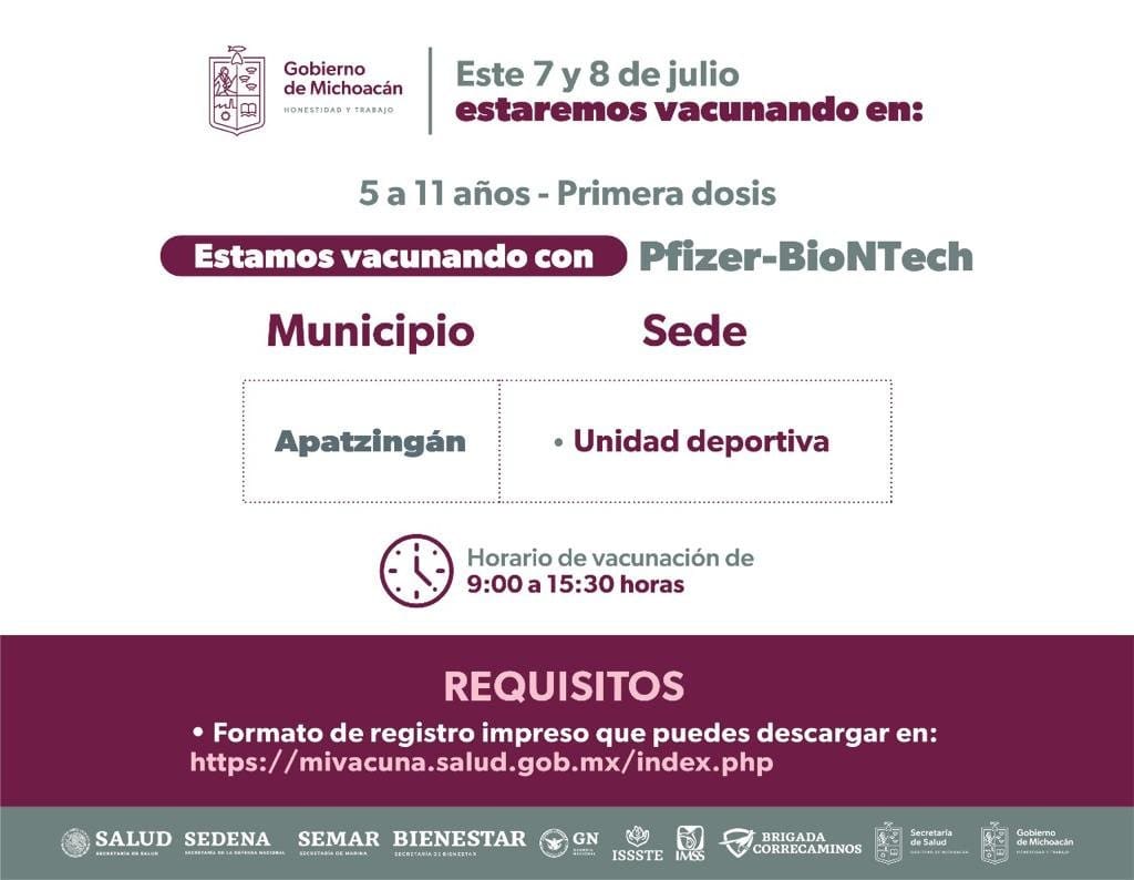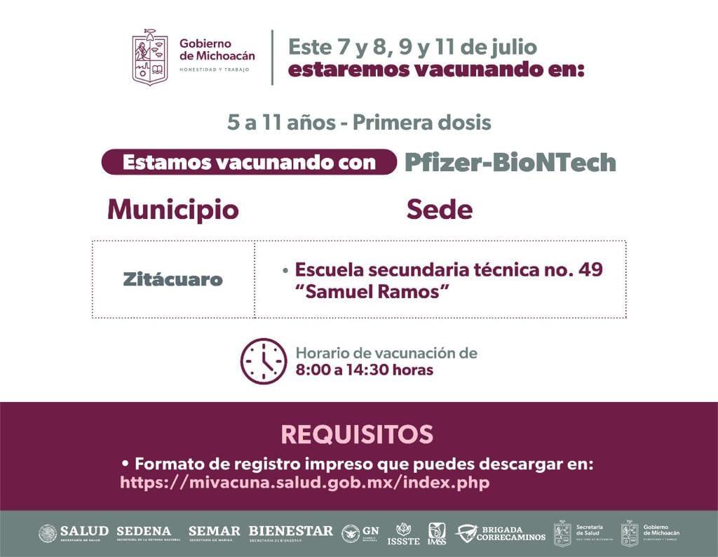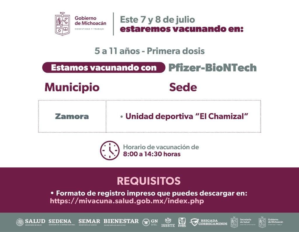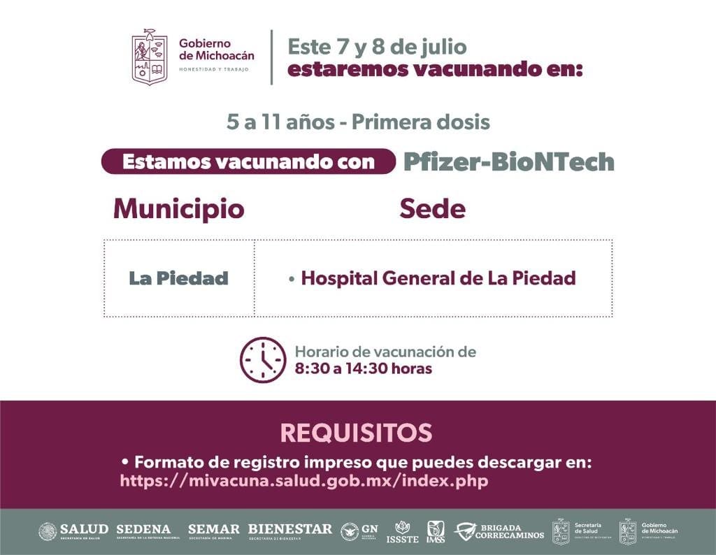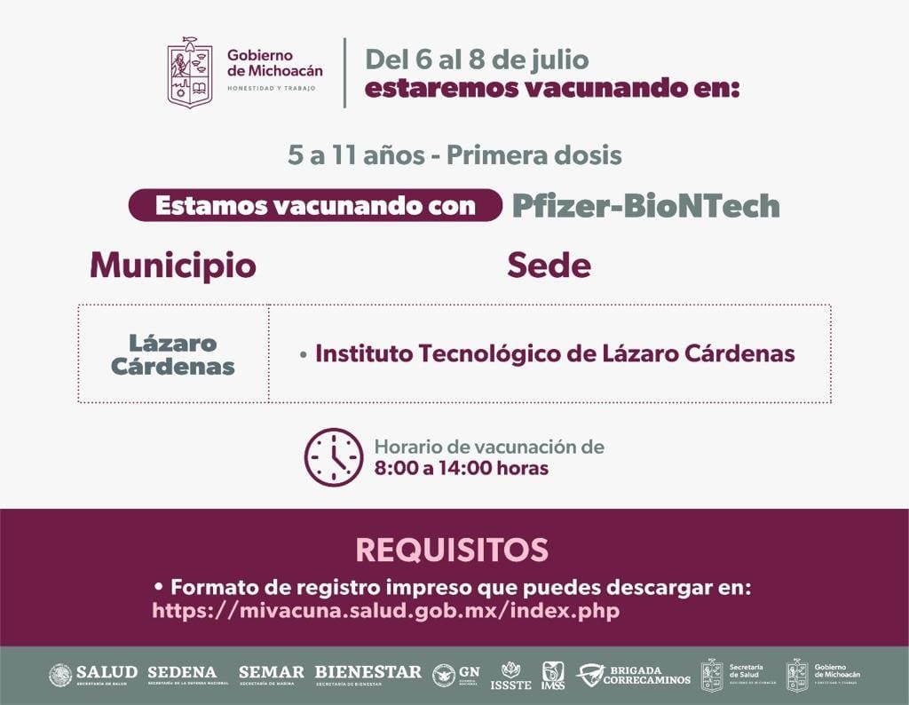 Morelia, Michoacán, 7 de julio del 2022.- Para dar continuidad al Plan Nacional de Vacunación, del 7 al 8 de julio, se inmunizará a los niños de 5 a 11 años de edad en los municipios de Zitácuaro, Pátzcuaro, Apatzingán, Zamora, Lázaro Cárdenas y La Piedad.