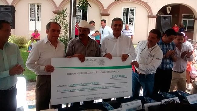 Sahuayo, Michoacán.- El Delegado de la Secretaria de Medio Ambiente y Recursos Naturales en el estado, Mauro Ramón Ballesteros, hizo entrega de recursos del Programa de Empleo Temporal a los municipios de Tocumbo, Cotija y Sahuayo.