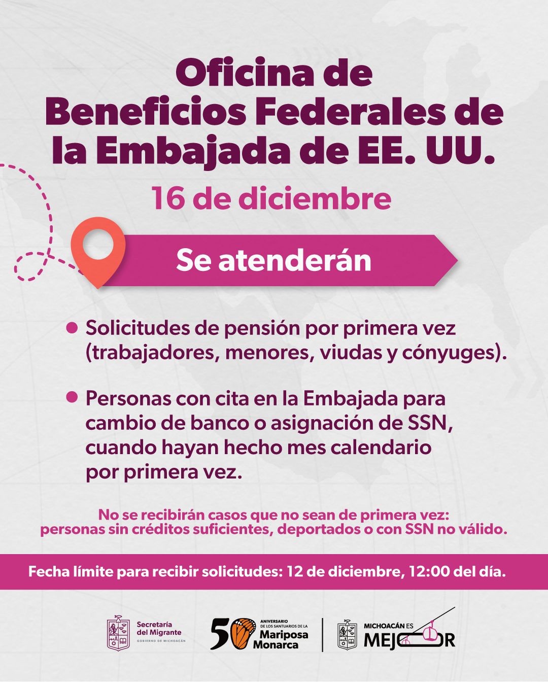 La Secretaría del Migrante (Semigrante) informa que el próximo 16 de diciembre contará con la visita del personal de la Oficina de Beneficios Federales (FBU) de la Embajada de los Estados Unidos en México. El propósito es fortalecer la atención a los michoacanos que buscan acceder a una pensión del Seguro Social estadounidense.