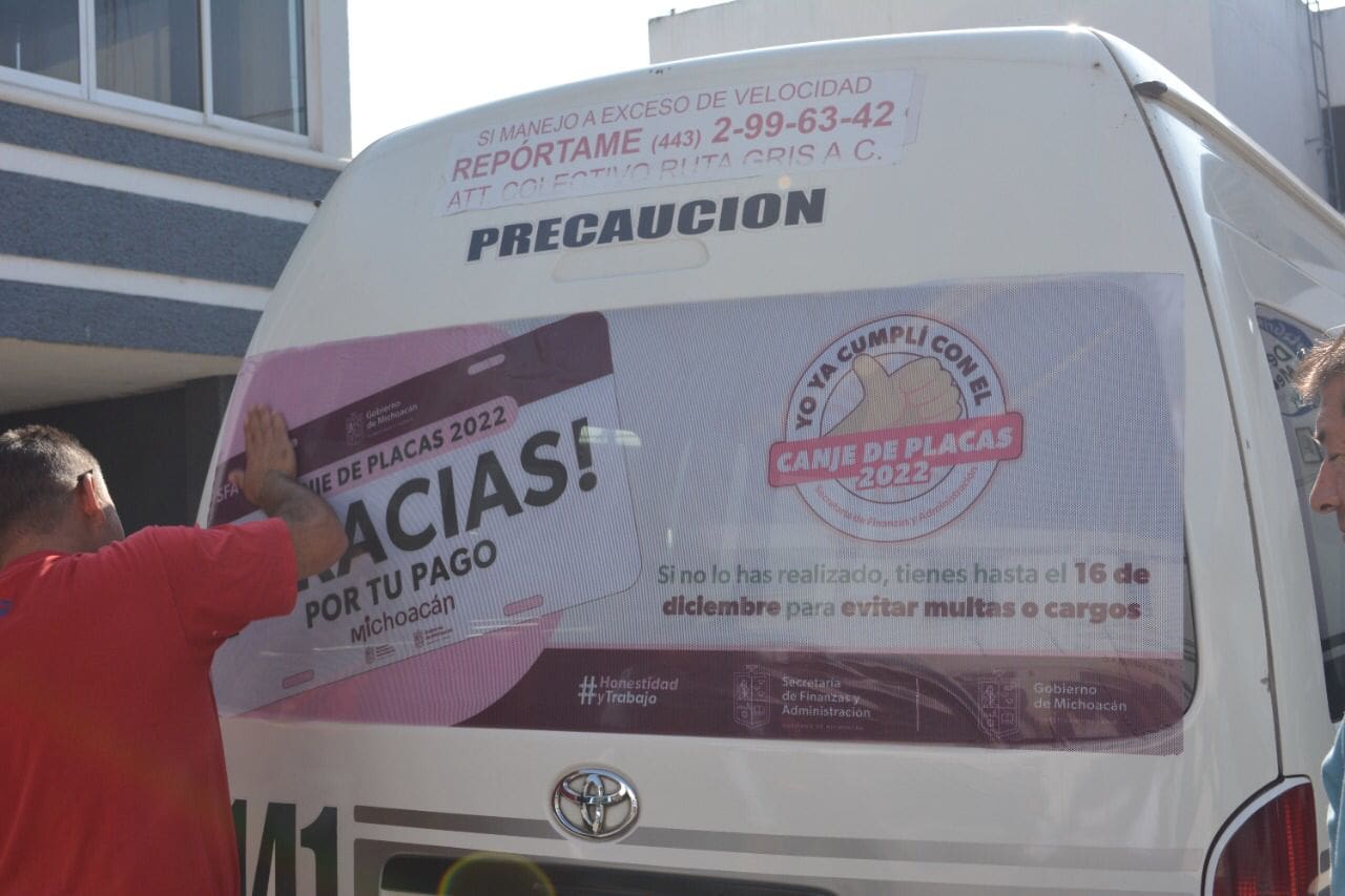 Morelia, Michoacán, 24 de noviembre del 2022.- La Secretaría de Finanzas y Administración (SFA) del Gobierno de Michoacán, en coordinación con diferentes rutas del transporte público, inició el pegado de calcomanías en camionetas y vehículos de pasajeros, con el reconocimiento a los ciudadanos que ya cumplieron con el trámite y el pago de refrendos y placas de circulación, y la invitación de hacerlo a aquellos ciudadanos que, por diferentes motivos, no han acudido a los módulos o a las ventanillas recaudadoras.