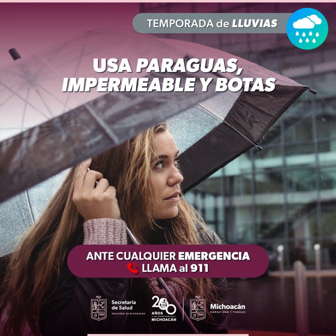 Morelia, Michoacán, 22 de junio de 2024.- De acuerdo con el Servicio Meteorológico Nacional (SMN) para este sábado se pronostican lluvias muy fuertes para algunas regiones de Michoacán, por ello, la Secretaría de Salud (SSM) invita a la población a no relajar medidas sanitarias.