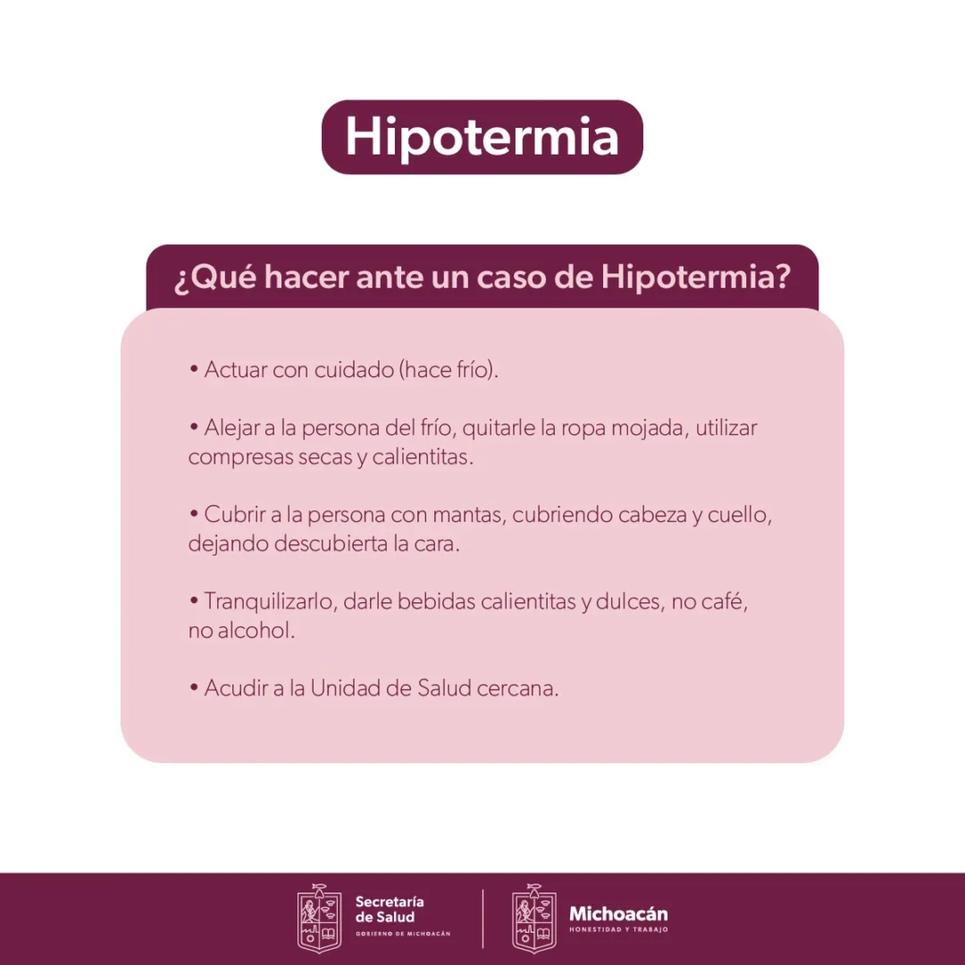 Morelia, Michoacán, 27 noviembre de 2023.- Durante esta temporada invernal se presentan masas polares que transportan aire frío y comienzan los fuertes vientos; por ello, la Secretaría de Salud de Michoacán (SSM), exhorta a la población a abrigarse y no exponerse a las bajas temperaturas, principalmente en la madrugada, para prevenir casos de hipotermia.
