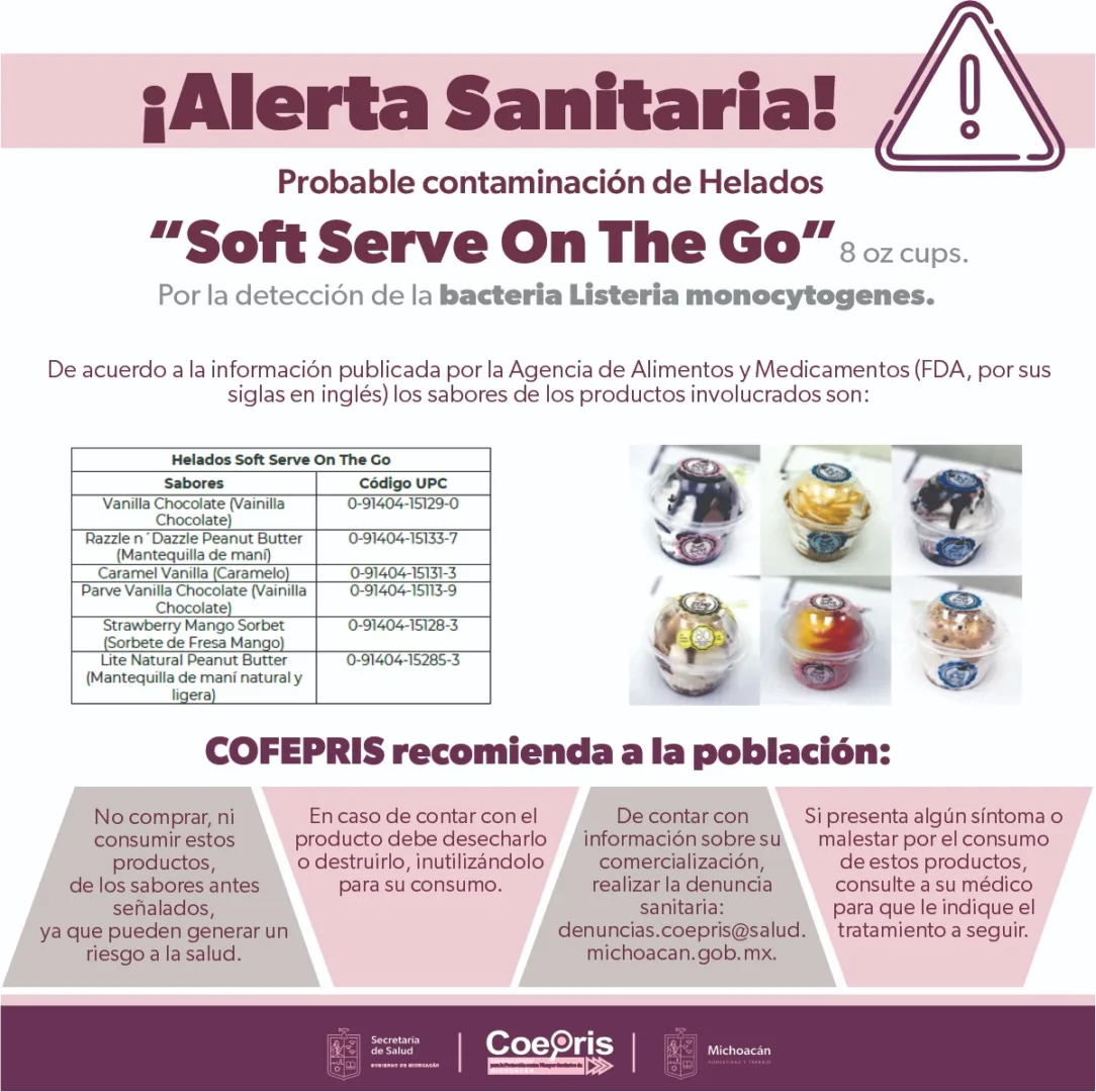 Morelia, Michoacán, 22 de agosto de 2023.- La Comisión Federal para la Protección contra Riesgos Sanitarios (Cofepris), a través de la Secretaría de Salud de Michoacán (SSM), informa a la población sobre la probable contaminación por Listeria monocytogenes de los helados Soft Serve On The Go, productos distribuidos en nuestro país.