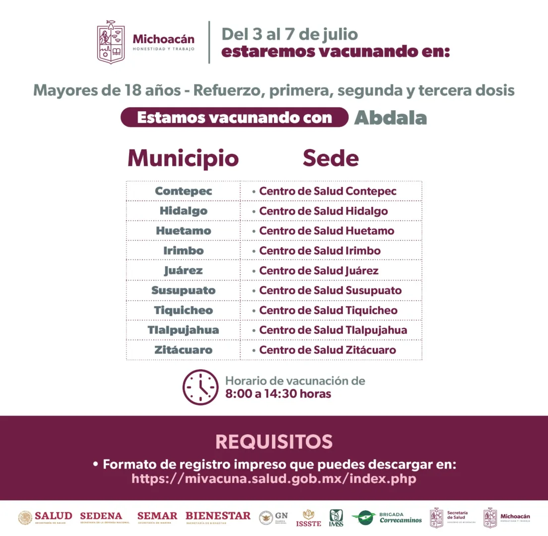 Del 3 al 31 de julio del año en curso se inmunizará con el biológico Abdala a habitantes de Acuitzio, Ario, Carácuaro, Coeneo, Erongarícuaro, Huiramba, Jiménez, Lagunillas, Madero, Nocupétaro, Panindícuaro, Pátzcuaro, Quiroga, Salvador Escalante, Tacámbaro, Turicato, Tzintzuntzan y Zacapu.