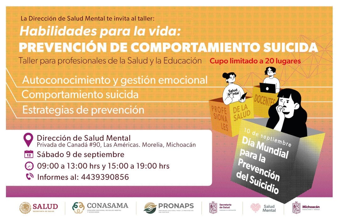 Morelia, Michoacán, 6 de septiembre de 2023.- En el marco del Día Mundial para la Prevención del Suicidio, la Secretaría de Salud de Michoacán (SSM), a través de la Dirección de Salud Mental, realizará el próximo sábado 9 de septiembre un taller de habilidades para la vida, con el objetivo de identificar y atender de manera oportuna a niñas, niños y adolescentes con comportamientos suicidas en instituciones educativas.