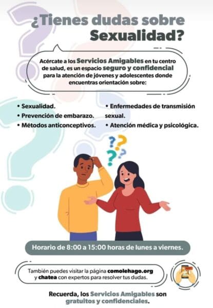 Además, se fomenta la participación de los estudiantes, con el fin de prevenir y promover el ejercicio de una sexualidad sana, plena y también responsable, ya que durante la adolescencia es más común el embarazo no deseado con sus consecuencias y que para ello las y los jóvenes y adolescentes cuentan con los servicios amigables en los centros de salud y con la página de resolución de dudas comolehago.com.