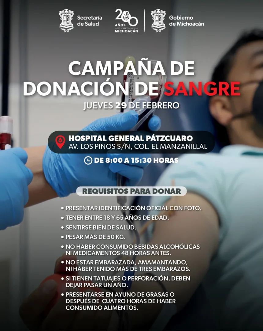 Morelia, Michoacán, 28 de febrero de 2024.- Para apoyar a los pacientes que se encuentran en tratamiento oncológico y requieren de transfusiones sanguíneas, el Hospital General de Pátzcuaro llevará a cabo este jueves 29 de febrero una Jornada de Donación Sanguínea, a la que invita a la población a sumarse y salvar vidas.