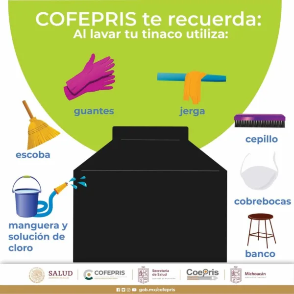 Con dicha solución se tallan paredes y piso con un cepillo, lo más rápido posible (no más de 10 minutos o hacer pausas), utilizar cubrebocas o trapo húmedo en el rostro y guantes, para evitar una intoxicación. La solución se debe enjuagar de 20 a 30 minutos después, se seca el tinaco y se llena con agua limpia. Al final se coloca una pastilla de cloro para desinfectar el líquido.