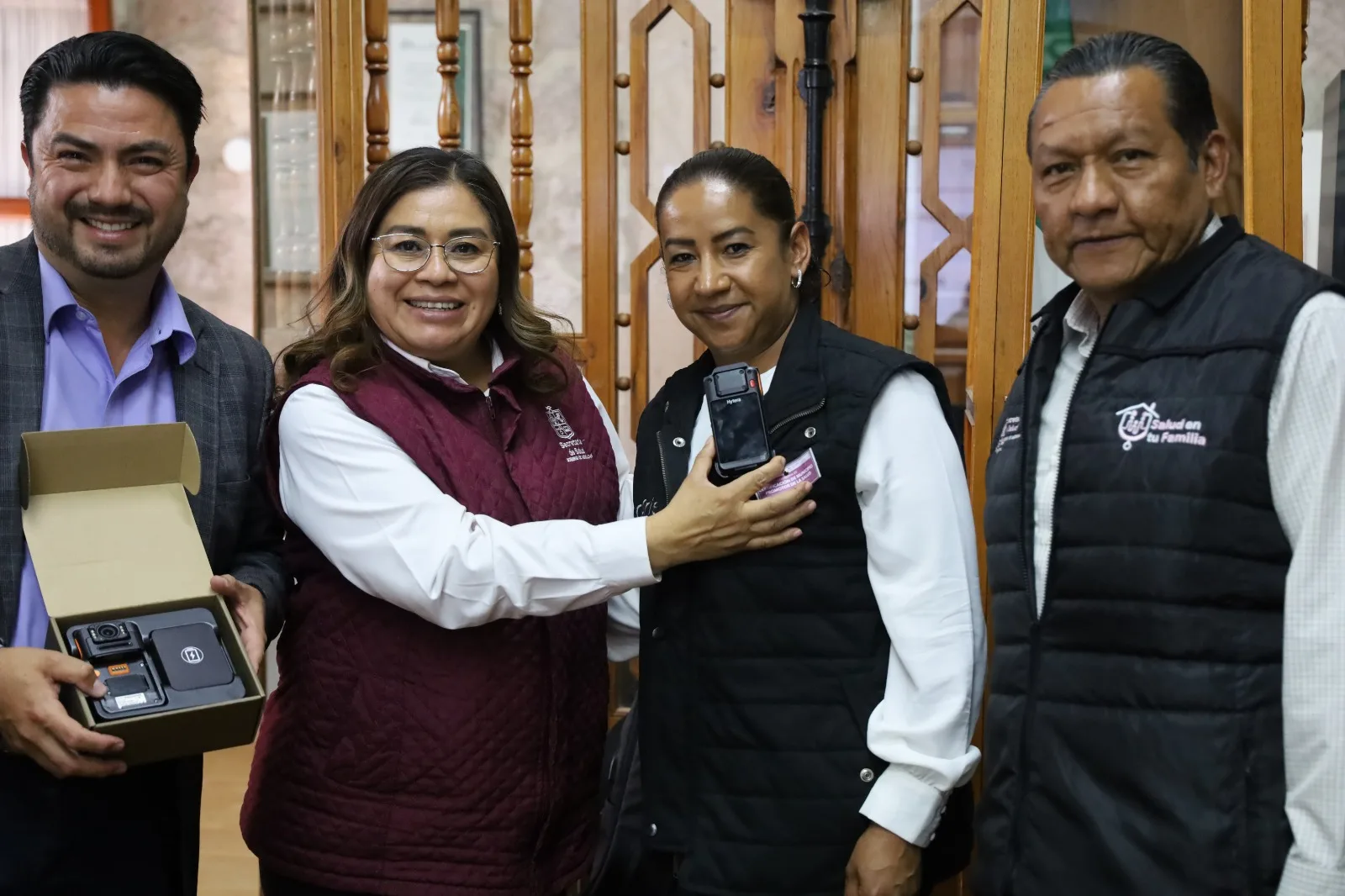 Morelia, Michoacán, 15 de febrero de 2024.- Como parte de las acciones para prevenir e inhibir posibles actos de corrupción, durante la vigilancia sanitaria a los establecimientos médicos y comerciales, fueron entregadas 15 cámaras de solapa a personal de la Comisión Estatal para la Protección contra Riesgos Sanitarios (Coepris).