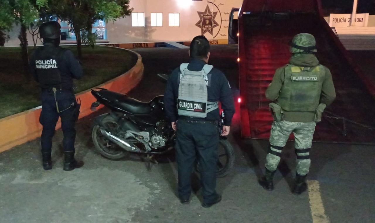 En los municipios de Zamora y Ario, y gracias a la coordinación con el personal de la Secretaría de la Defensa Nacional (Sedena) y de la Guardia Nacional (GN); fueron detenidos dos personas del sexo masculino, tras intentar evadir la presencia policial, les fueron asegurados un envoltorio con hierba verde y seca, al parecer marihuana y dos más con sustancia granulosa, con las características propias de la metanfetamina, así como una motocicleta marca Italika y otra de la marca Vento con reporte de robo.
