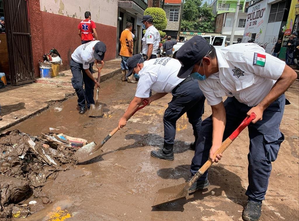 A las tareas de auxilio se sumaron cadetes de la Policía Michoacán y elementos del Ejército Mexicano, así como trabajadores municipales en un esfuerzo coordinado e institucional para una mejor atención a las familias de las cuatro colonias afectadas por el paso del agua.