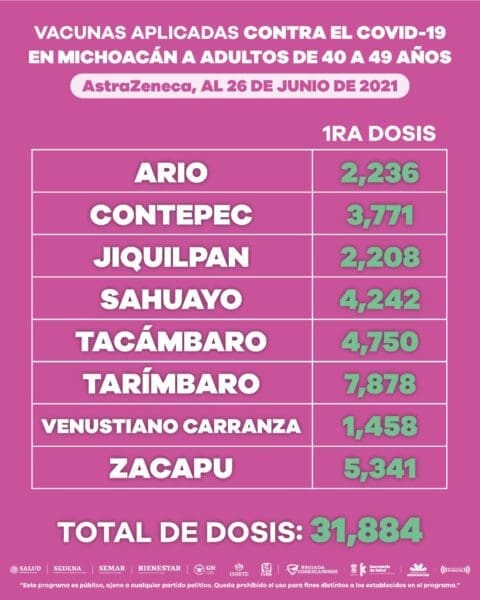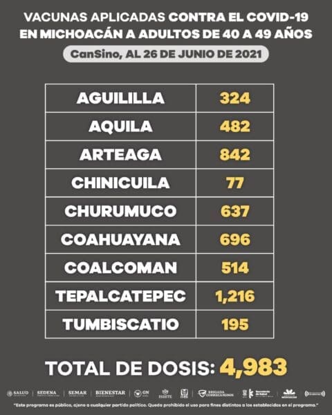Del total de vacunas aplicadas 4 mil 983 de CanSino fueron aplicadas en 9 municipios, 31 mil 884 de AstraZeneca en beneficio de 8 localidades; otras 141 mil 673 de Pfizer beneficiaron a habitantes de 8 municipios y finalmente 2 mil 602 de Sinovac fueron aplicadas en Hidalgo, Maravatío y Pátzcuaro.